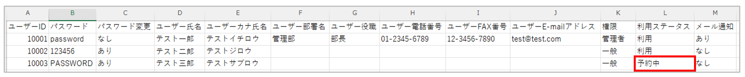 ※エクスポートファイルにて、予約中のユーザーはL列「利用ステータス」に「予約中」と表示がされます。
